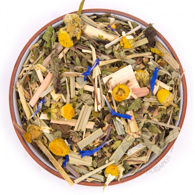 Мелисса, зверобой, лемонграсс, листья ежевики, листья мяты, цветы ромашки, лепестки василька